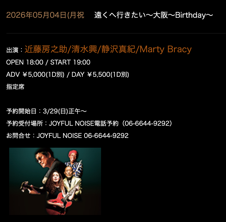 5月のスケジュール 2026-03-092026-04-13 admin 5/4 (Mon) 高槻ジャズストリートSoulbleed13:00 野見神社 能楽堂 5/4 (Mon) 大阪 難波 music bar S.O.Ra. 5/10 (Sun) 神戸新開地音楽祭菊田俊介 SPECIAL BAND